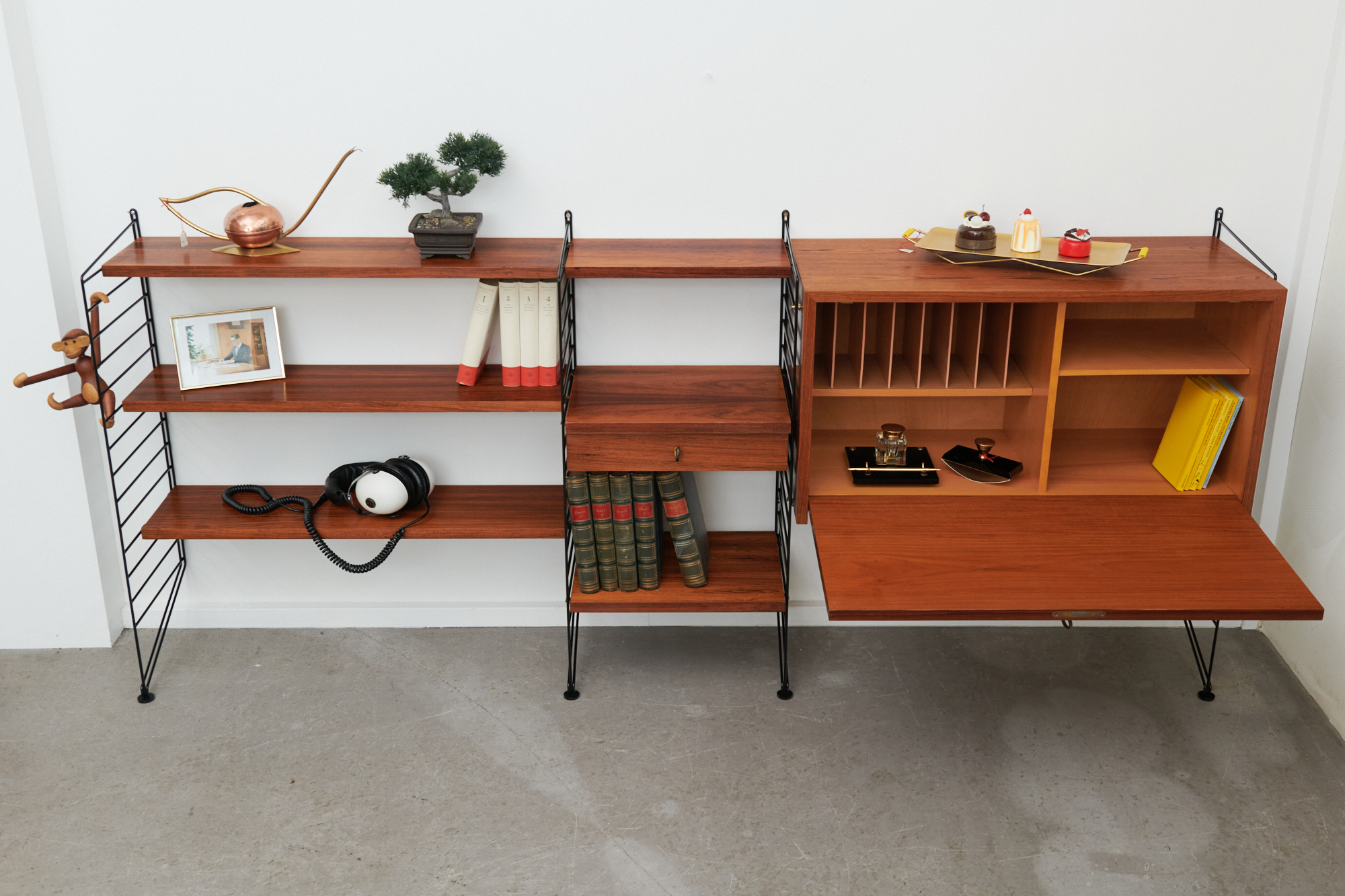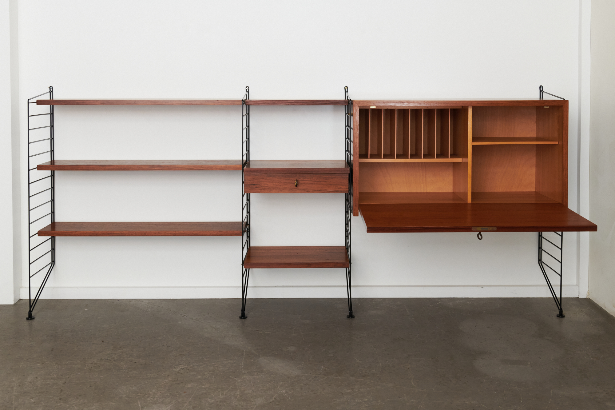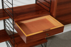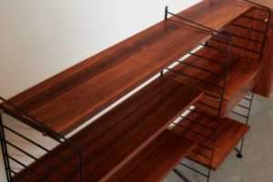 Restored: 3-line STRING shelving system RIO PALISANDER 200x85cm, 1960s, design: NISSE STRINNING, Sweden, all elements freely combinable/positionable, in the most valuable version; real wood Rio Palisander – incomparably beautiful tropical wood, 4 floor ladders, metal black