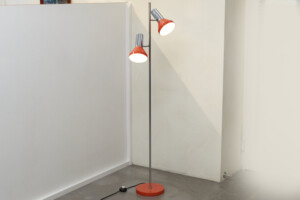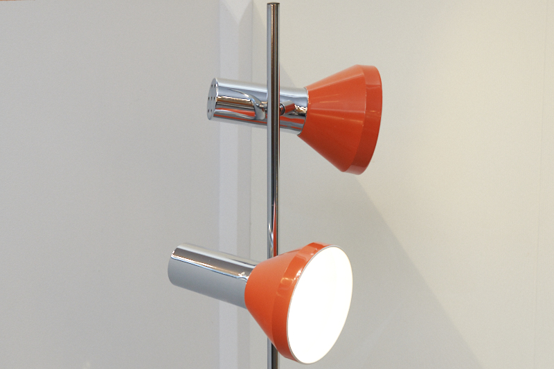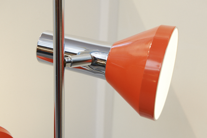 Restored: 2-person floor lamp GURA, orange, 1960s, production:GURA LEUCHTEN; W. Germany, orange metal shades with chrome cylinders, bags on swivel/hinge joints, chrome rods, orange metal base, foot switch, 2x E27