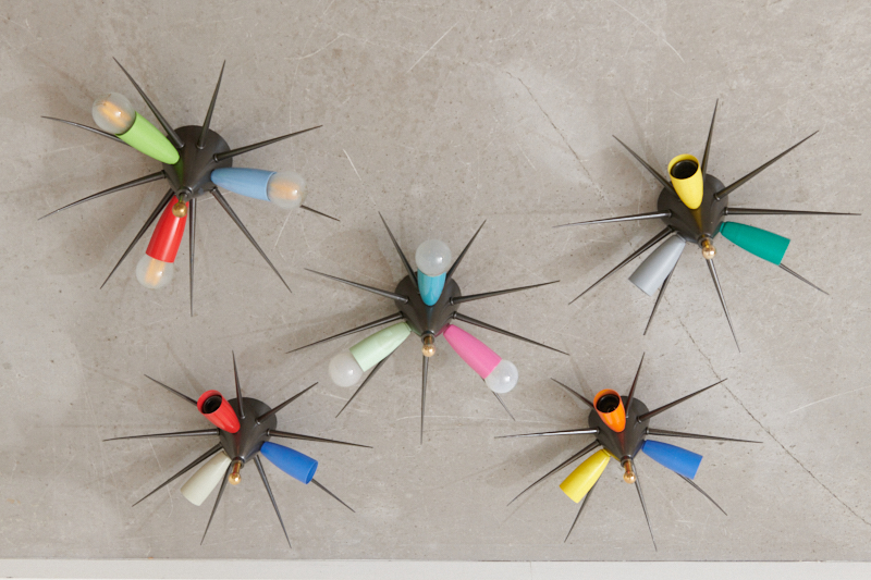Description: Restored: Rare ceiling lamp SPUTNIK COLOR II, 1950s, 3 colorful ornamental sockets directly at the base in the colors gray, red & blue, base made of black metal with 6 sputnik beams, newly wired, 3x E14