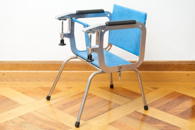 Restored: Robust children’s multifunctional chair by RÖSCHLI/BÜHLER (CH), 1950s, child’s seat with table fixation with new anti-slip pads and removable leg frame, cleaned, sky-blue vinyl covers, wood, cast aluminum, incl. play plate with fall protection edge
