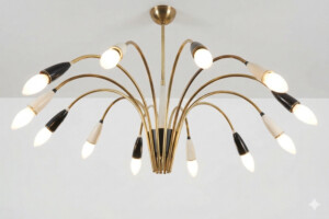 Restored: 12-light ceiling chandelier KASSANDRA, 1950s, brass arms with black & cream white bakelite bag sockets, brass pendant tube, brass canopy, 12x E14