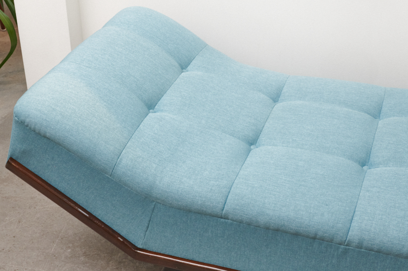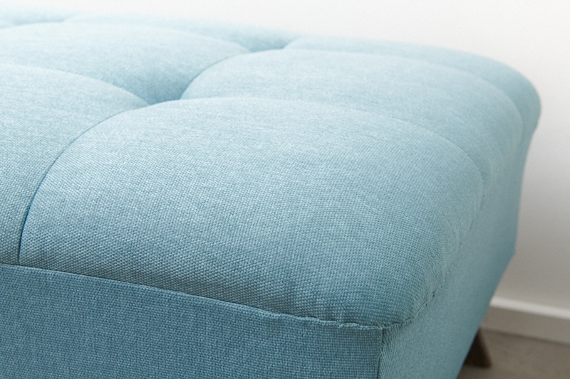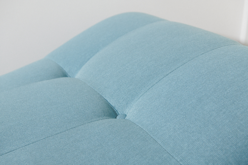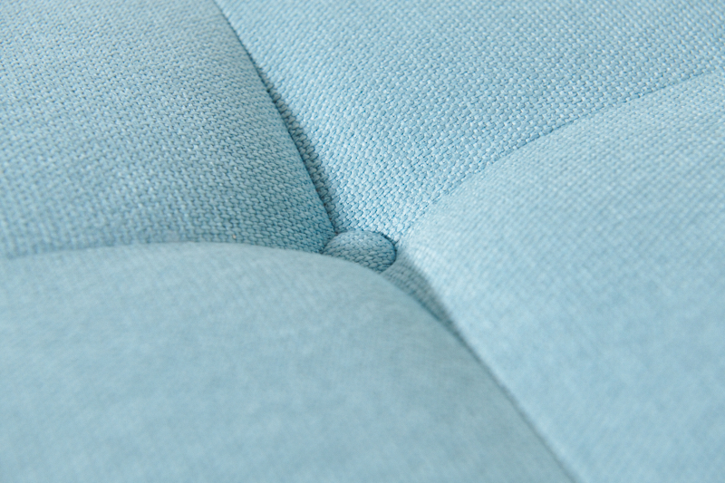 Solid wood frame with steel spring core substructure, on it a complex structure of cover fabrics, cold foam & wadding, covered with high-quality woven fabric in sky blue, Swiss handwork