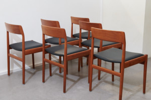 Restored: Set of 6 teak chairs designed by JOHANNES NORGAARDS, genuine leather, 1965, production: NØRGAARDS MØBELKABRIK, Made in Denmark, frame made of solid teak, newly upholstered, newly padded, newly covered with high-quality finest nappa leather in black from Italy (free of harmful substances according to EU regulations)
