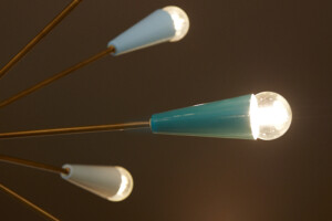 BLISS STUDIO Custom-made: Ceiling chandelier SPUTNIK AQUA, zaponized brass handmade, 24 brass arms in two lengths, metal decorative bags in blue, green and grey tones, brass ball & canopy, 3-part pendant tube for different heights (72-117-158cm, can also be shortened or extended) , 24x E14/E27