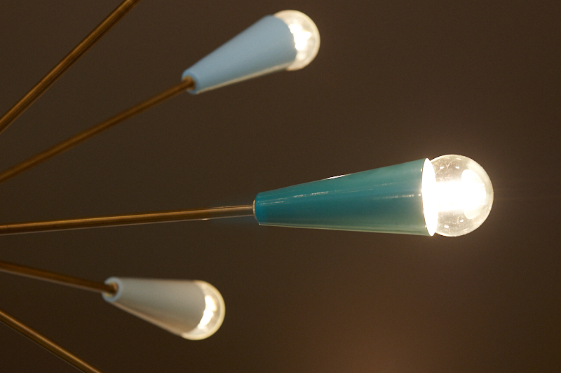 BLISS STUDIO Custom-made: Ceiling chandelier SPUTNIK AQUA, zaponized brass handmade, 24 brass arms in two lengths, metal decorative bags in blue, green and grey tones, brass ball & canopy, 3-part pendant tube for different heights (72-117-158cm, can also be shortened or extended) , 24x E14/E27
