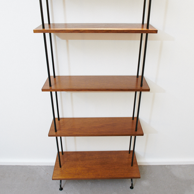 Description: Restored: The clever, slim shelf VARIA TEX, 1960s, solid wood, black metal, free-standing & very robust, the number of shelves can be freely determined & easily converted without tools, can be dismantled flat for transport/shipping