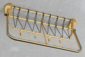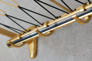 Restored: Wall coat rack VALDRIN DeLuxe, 1950s, 4 adjustable hooks, gold anodized aluminum, kidney-shaped sides, spaghetti covering in black & white
