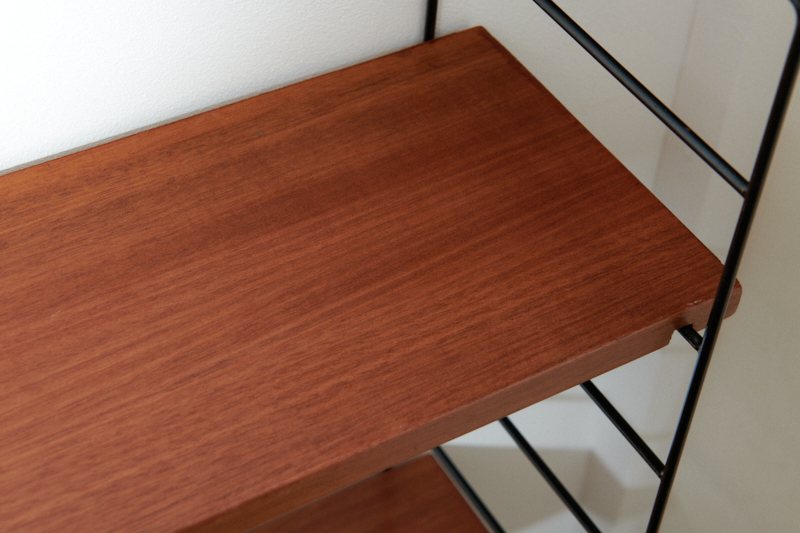 Restauriert: 2-zeiliges Wandregal D-STRING, Teak, 1960er, Germany, 6 frei platzierbare Regalböden, teakfurniertes Vollholz, schwarze Stahlleitern, sehr einfach zu montieren