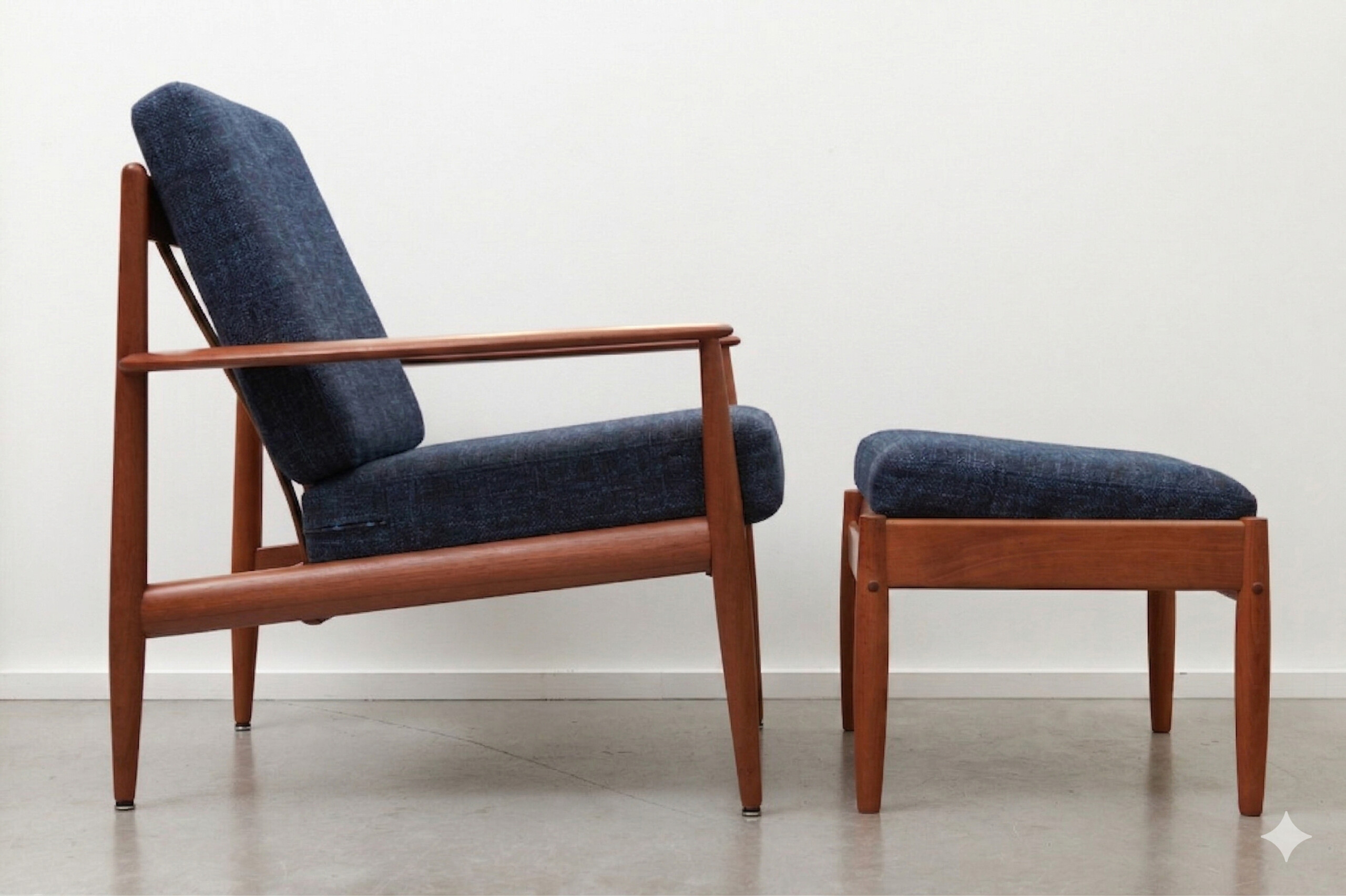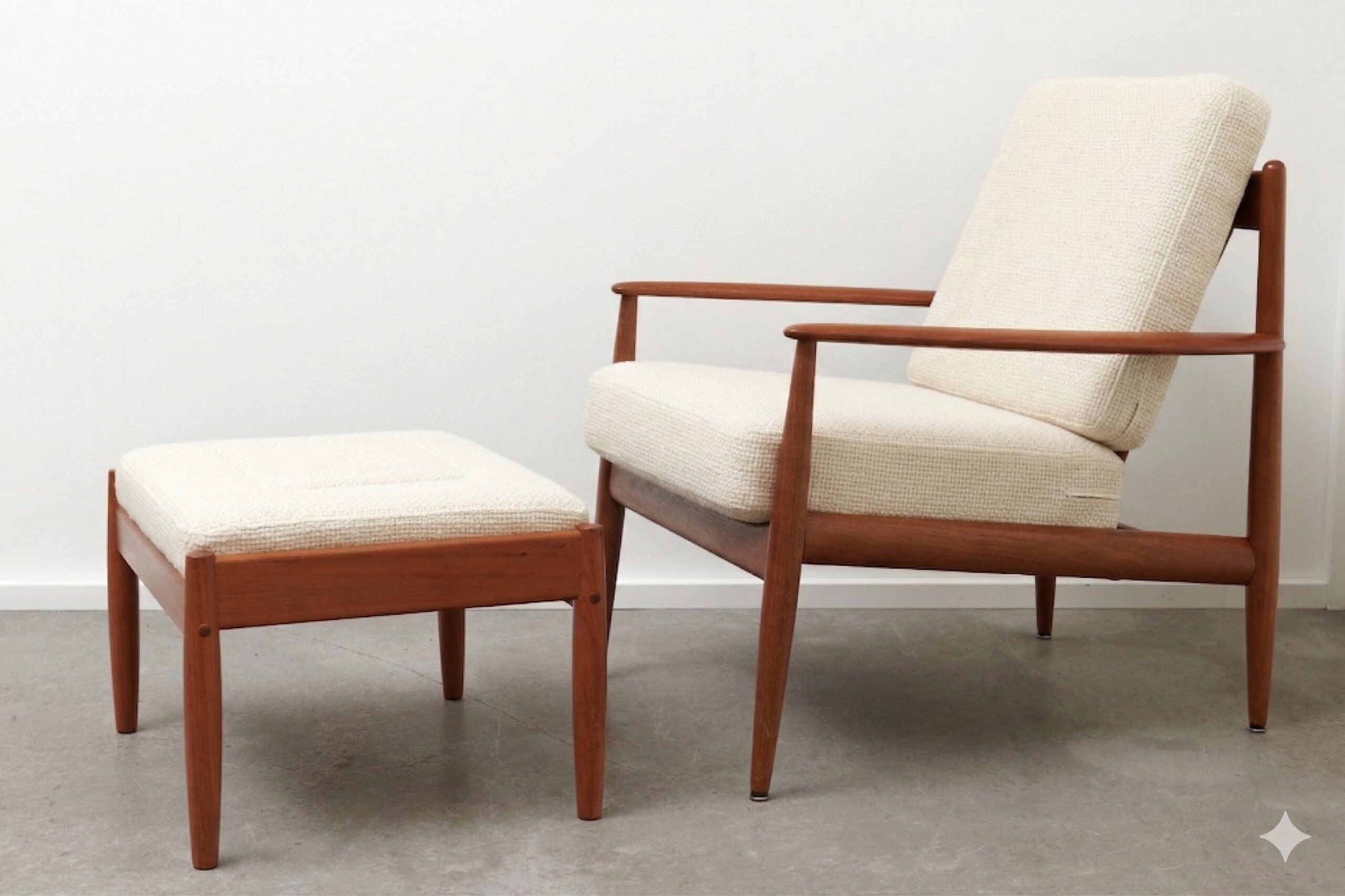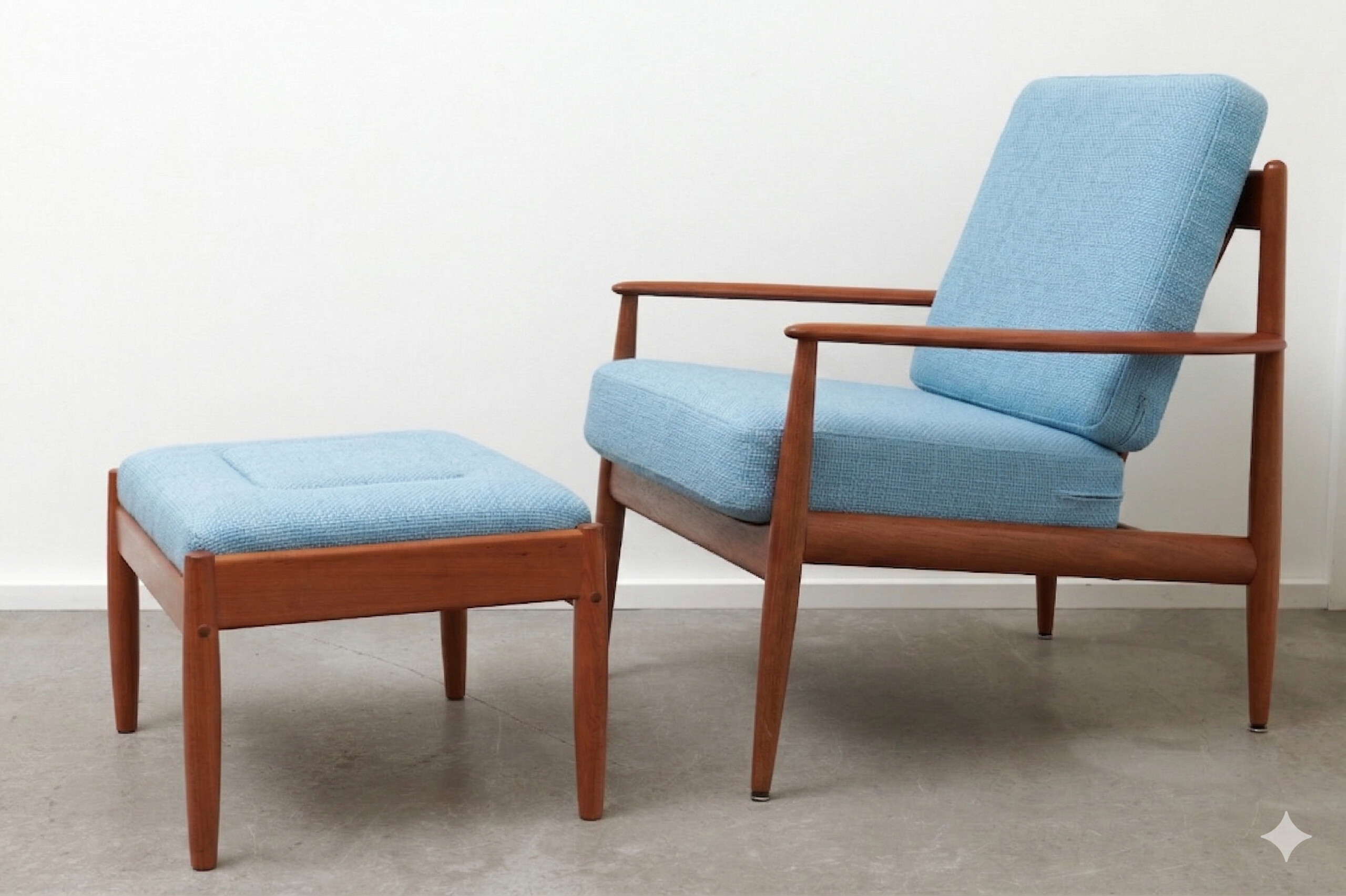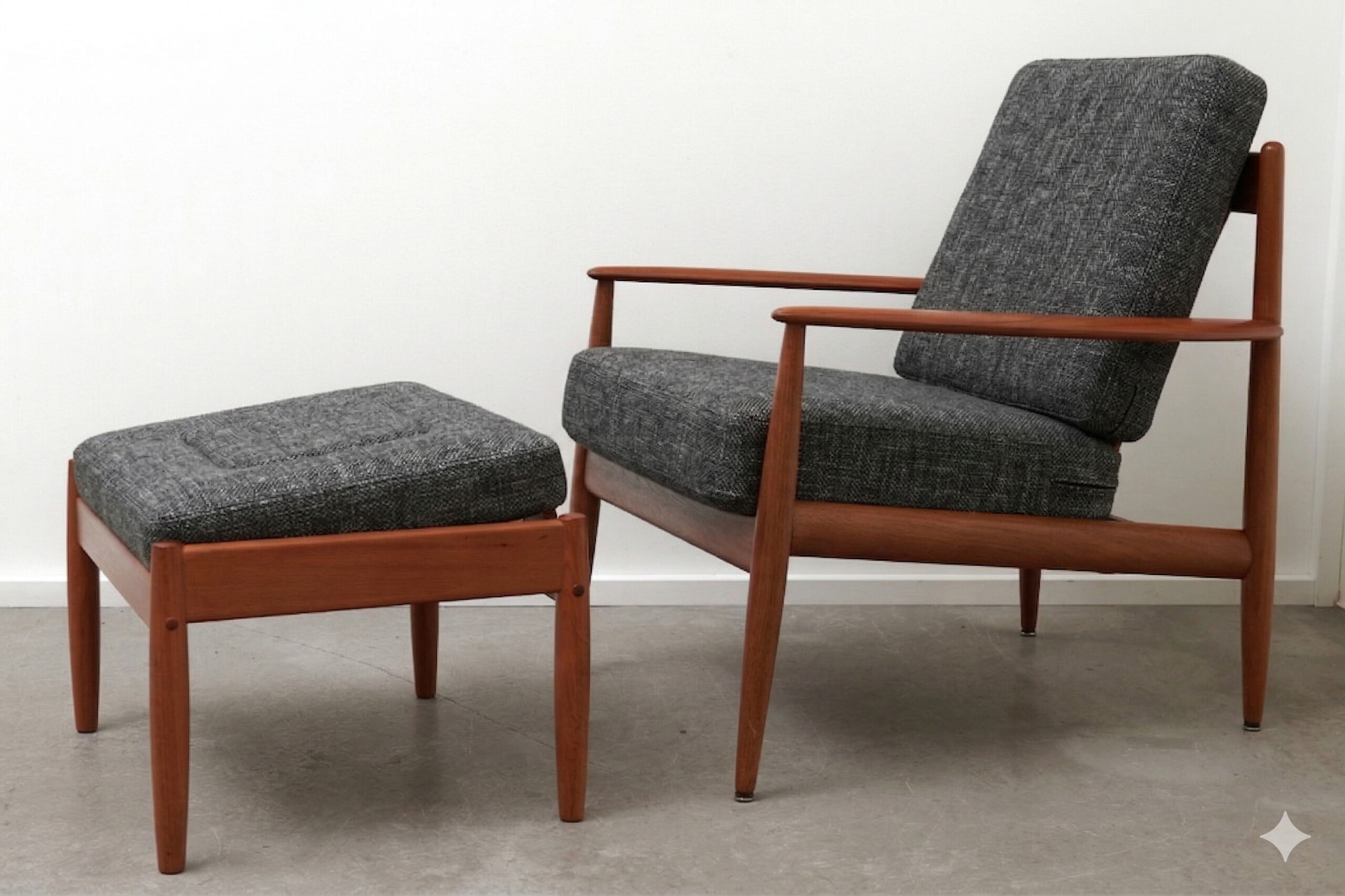 Aufwendig restauriert: Teak-Sessel 2er Set: Teak-Sessel mit Ottoman GRETE JALK, 1950er – FREIE STOFFWAHL, Design: Grete Jalk, Produktion: France & Son, Made in Denmark, 1950er, mehrfach geöltes massives Teakholz mit wunderschöner Holzmaserung, inkl. des seltenen Ottomans mit einstellbarem Polsterwinkel für noch mehr Komfort, herrlich bequeme Stahlfederung mit neuer Wattierung, FREIE STOFFWAHL > Musterbücher liegen für Sie im Shop bereit