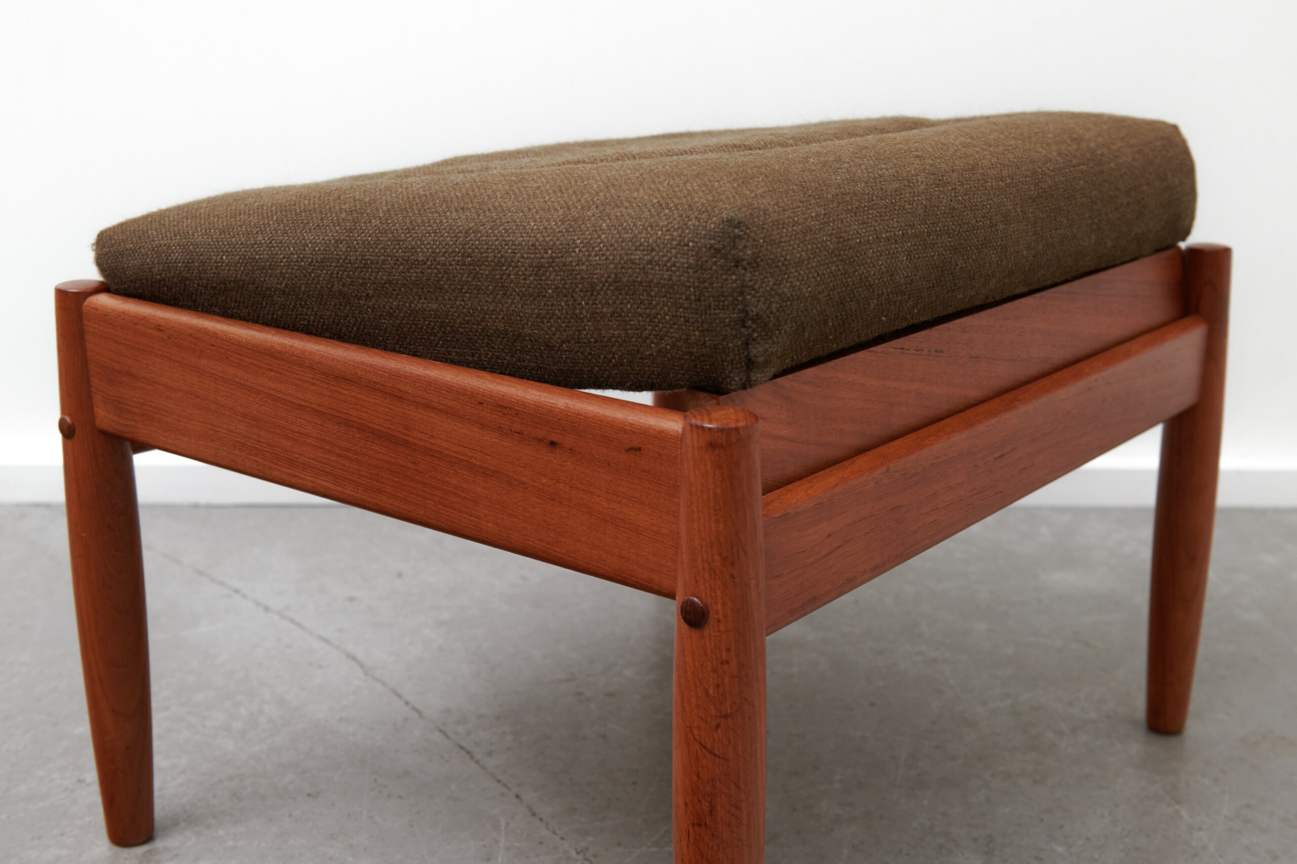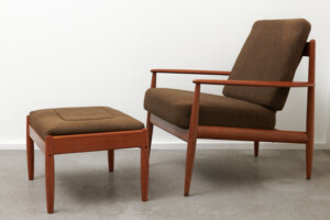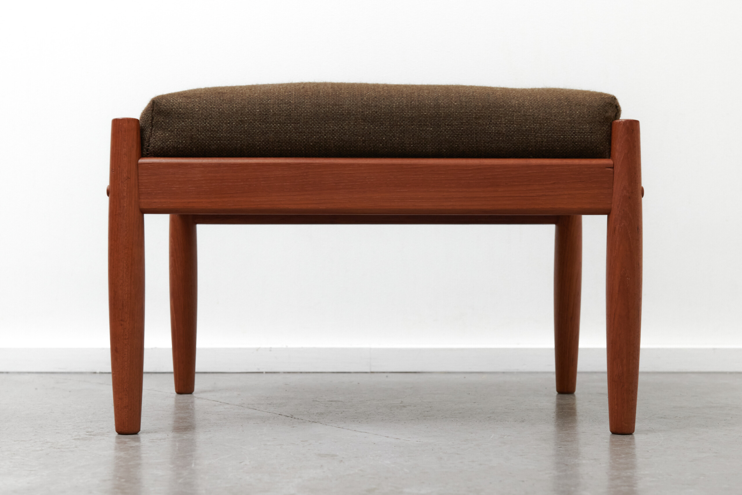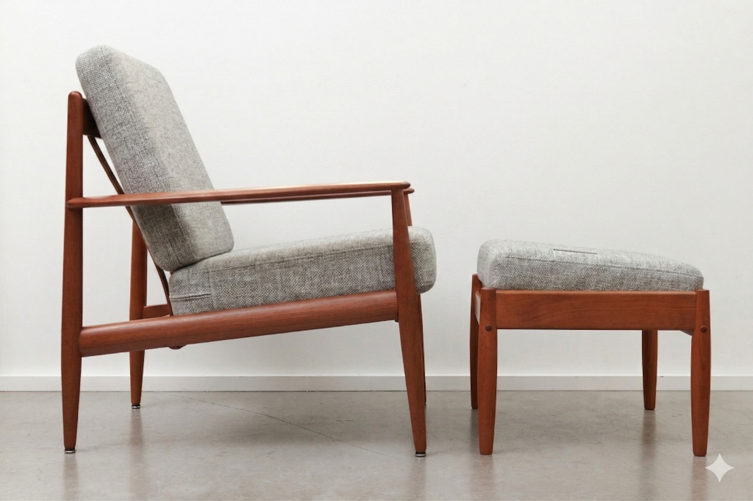 Aufwendig restauriert: Teak-Sessel 2er Set: Teak-Sessel mit Ottoman GRETE JALK, 1950er – FREIE STOFFWAHL, Design: Grete Jalk, Produktion: France & Son, Made in Denmark, 1950er, mehrfach geöltes massives Teakholz mit wunderschöner Holzmaserung, inkl. des seltenen Ottomans mit einstellbarem Polsterwinkel für noch mehr Komfort, herrlich bequeme Stahlfederung mit neuer Wattierung, FREIE STOFFWAHL > Musterbücher liegen für Sie im Shop bereit