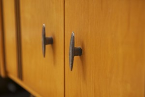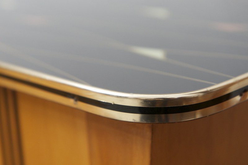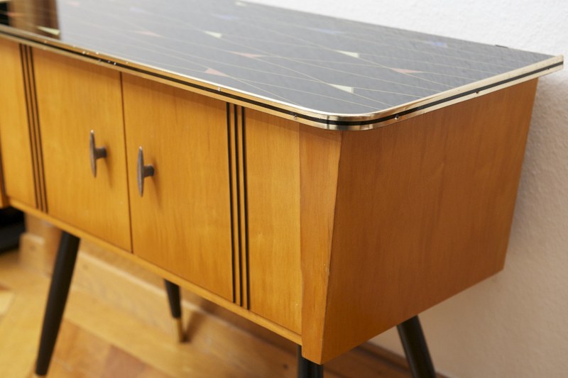 50er-Flurkommode GASMA, schwarze, gemusterte Glasoberfläche, Esche furniert, Massivholz-Tütenbeine, 2 Flügeltüren, Glasablage, L/B/H 72x32x55cm