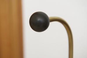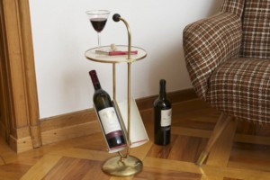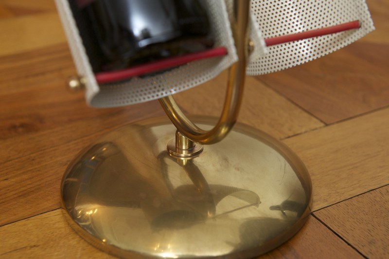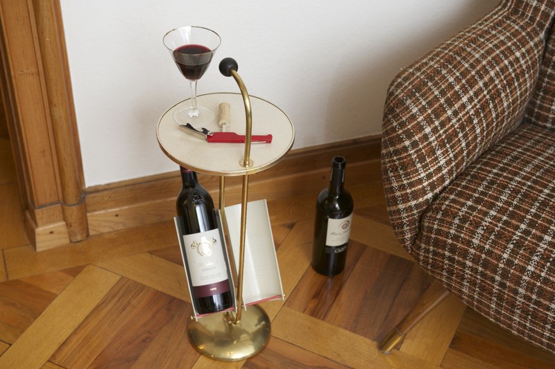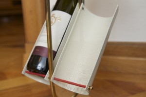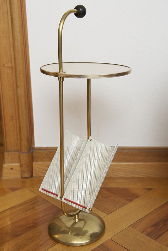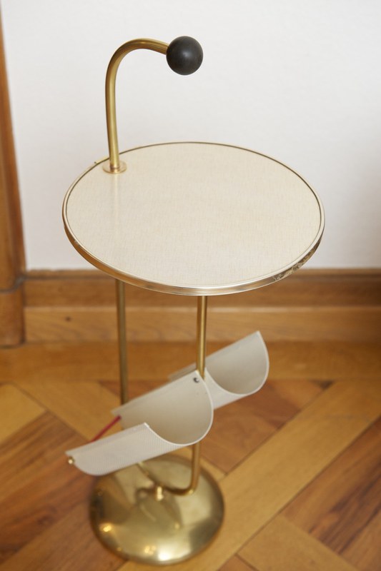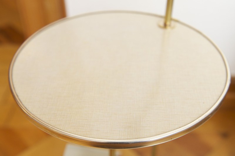 Rarität Bar-Beistelltisch (France, 1950) aus Messing mit Flaschenhalterung für 2 Flaschen (weisses Lochblech), Ablage in cremefarbenem Resopal, Top Zustand! H/Ø 63/25cm