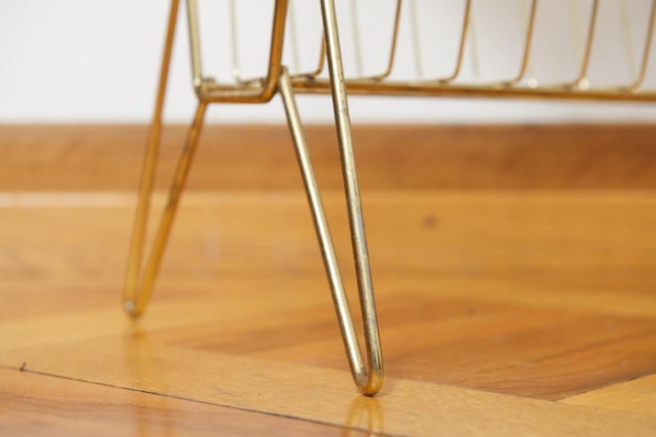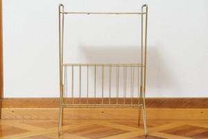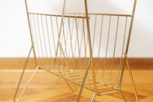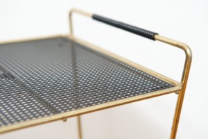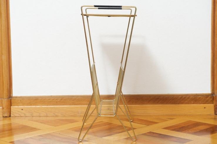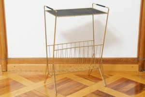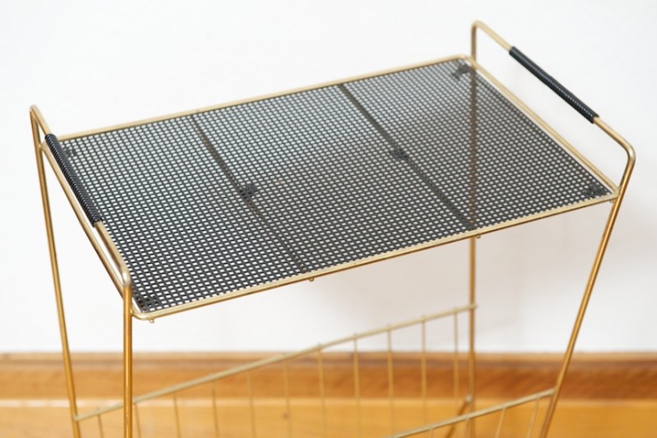 Beistelltisch mit Zeitungstsänder NERA TALA, schwarze Lochmetallablage, Zeitungsständer, goldenes Metallgestänge, schwarz umwickelte Griffe, schwarze Füsschen