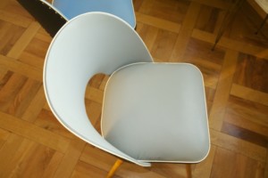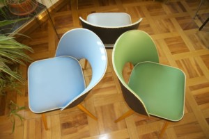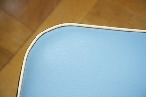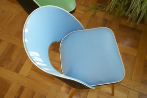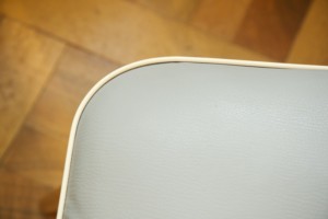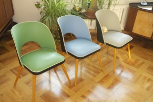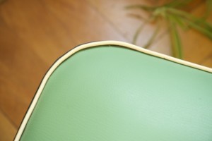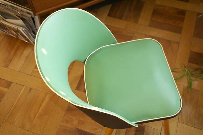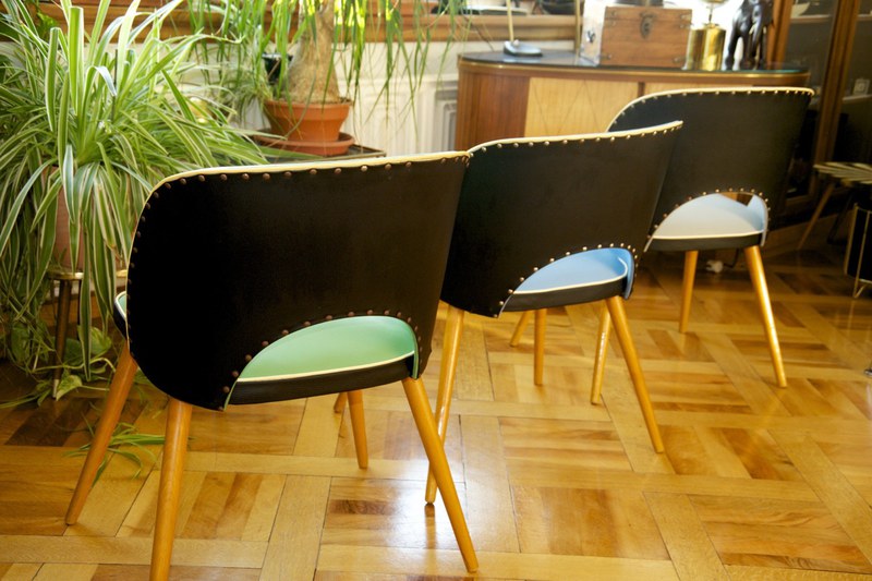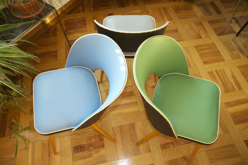 50ies-Cocktail sessel Trio mit Tütenbeinen aus Holz, Sitzpolster & Schale mit Vinylbezug in grün, grau, blau mit schwarz, Messing-Zierknöpfe, Federpolsterung, L/B/H 50x50x79cm
