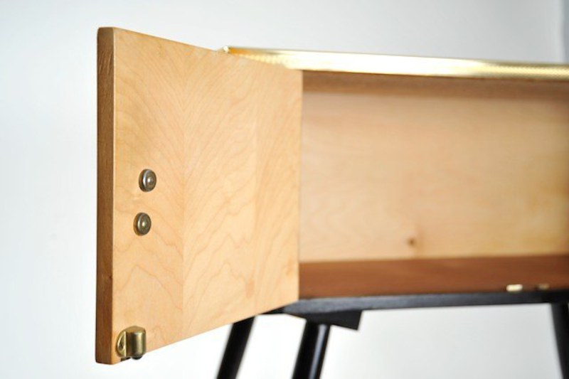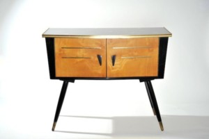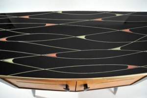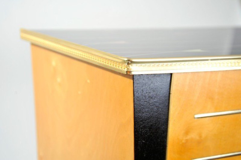 Schönes 50er-Jahre Schränkchen mit messinggefasster, gemusterter Glasplatte, birkefurniert, schwarzer Lack