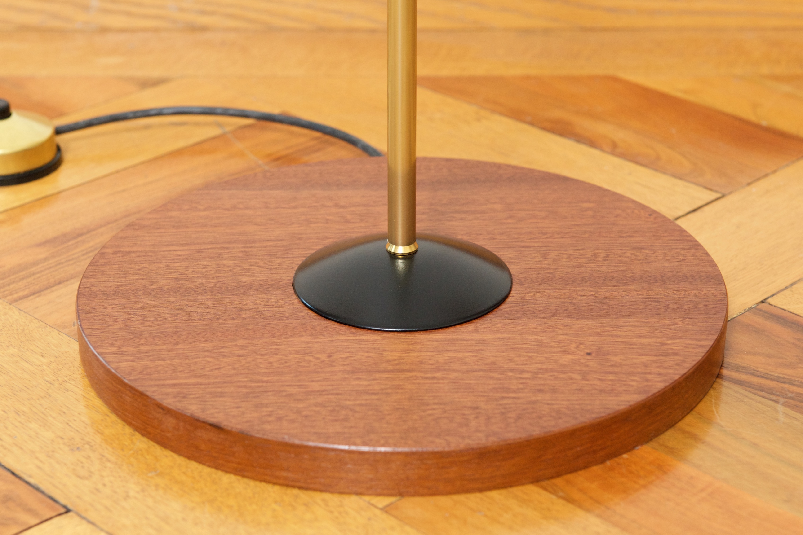 BLISS STUDIO Einzelanfertigung: Floor Lamp SUPERNOVA, 24 Messingarme mit schwarzen original 50er-Jahre-Fassungen, schwarze Metallbasis, Teakholz-Fuss, Messing-Tretschalter, 24x E14