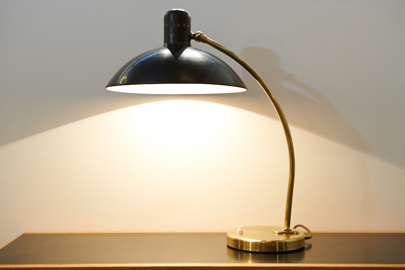 Restauriert: Grosse Tischlampe by SELOTA Germany, 1960er, Schirm aus schwarz lackiertem Metall mit Gelenkschraube, Arm & Fuss mit Gelenk aus poliertem Messing, Druckschalter, E27