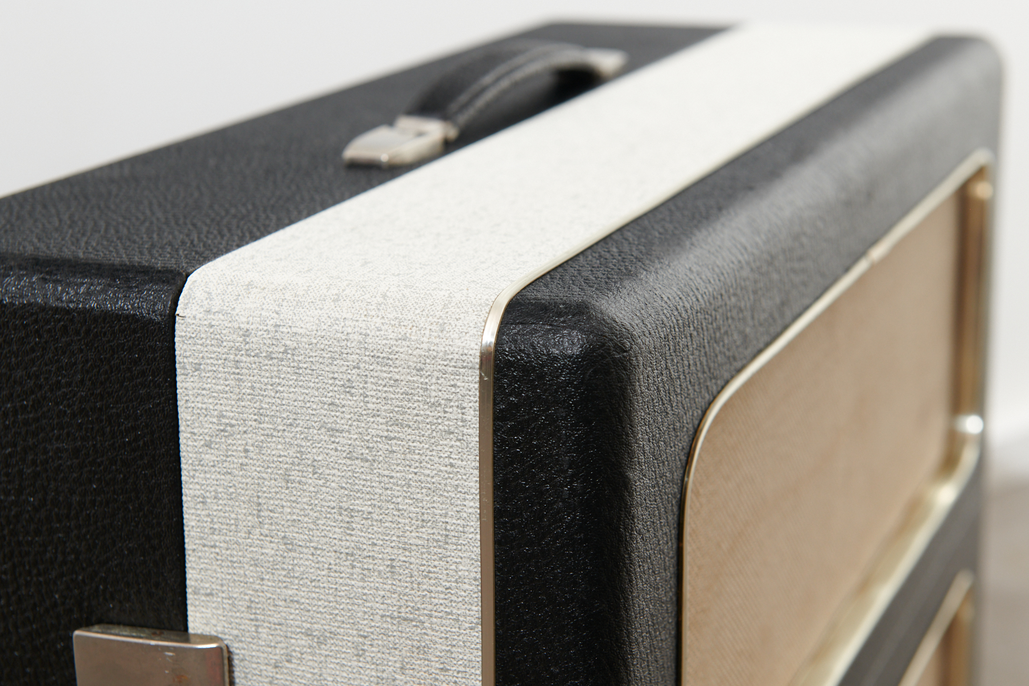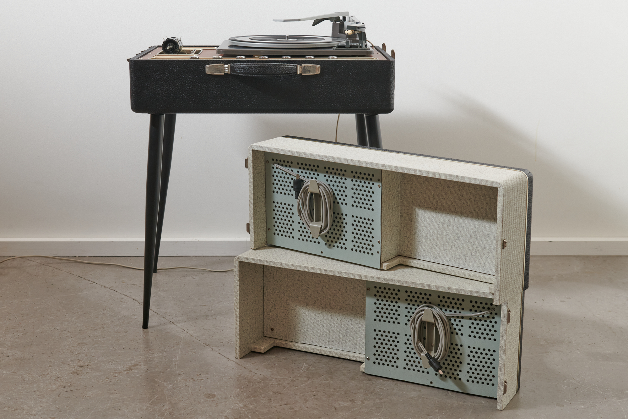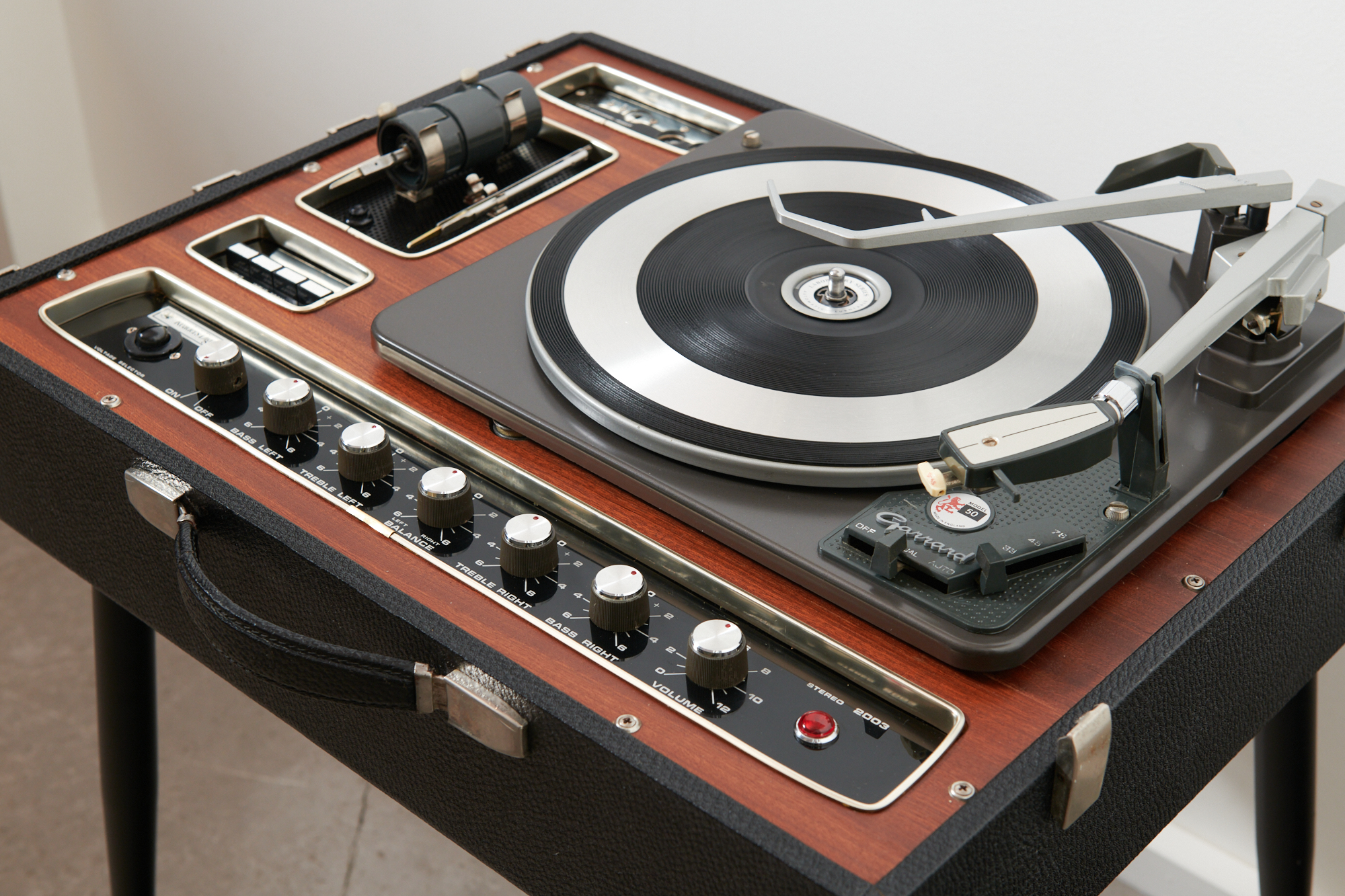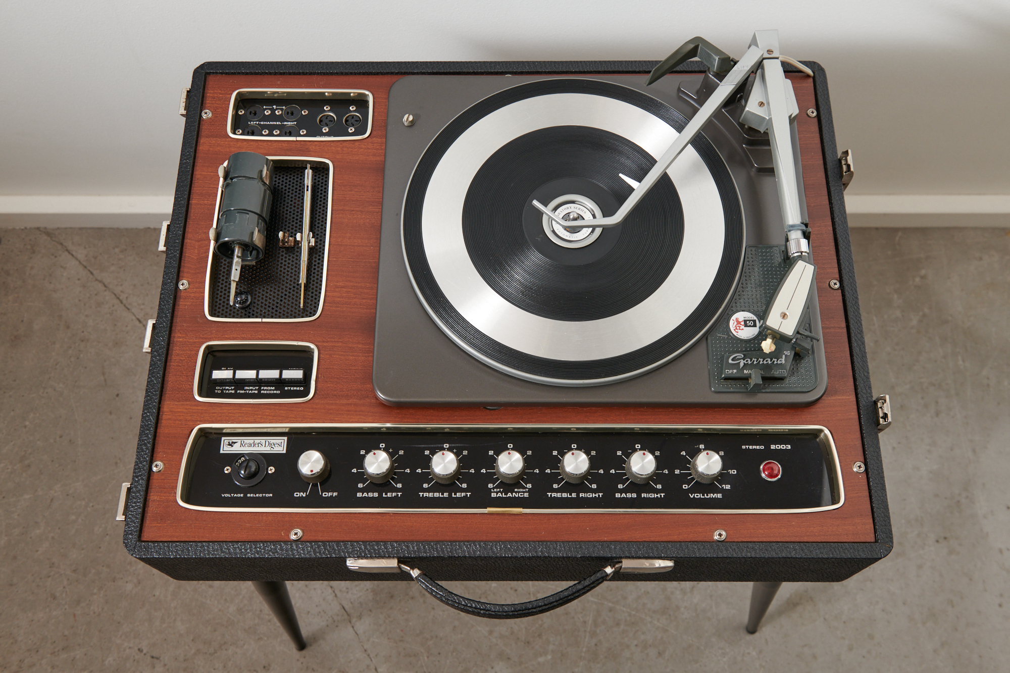 Restauriert & revidiert: HiFi-Stereo Plattenspieler-Koffer READER’S DIGEST Stereo 2003 / GARRARD Modell 50 (Plattenwechsler), 1963 – von READER’S DIGEST, Zürich, inkl. Stereo-Lautsprecher & Metallbeinen, Sammlerstück mit ausgezeichneter Tonabnahme und herrlich warmen Ton dank Röhrenverstärker.