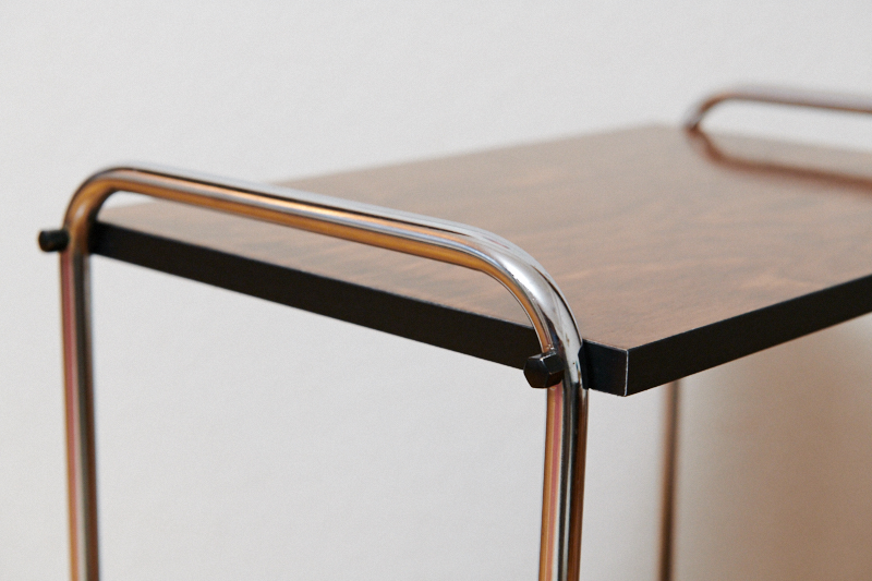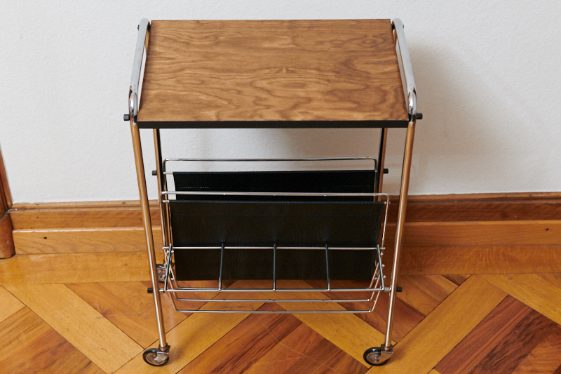 Restauriert: Mini-Bar auf Rollen mit Zeitungsablage HEDONA SILBER, 1950er, Holzablage mit schwarzen Kanten, Flaschenhalterung für Ihre 4 besten Flaschen, Zeitungsablage mit schwarzer Vinylbespannung, Chromgestänge, auf Rollen