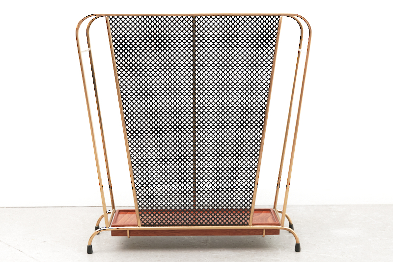 Restauriert: Schirmständer MATEGOT, 1950er, konisches Messinggestänge, schwarzes Ziermetall, eingelegte Holzschale