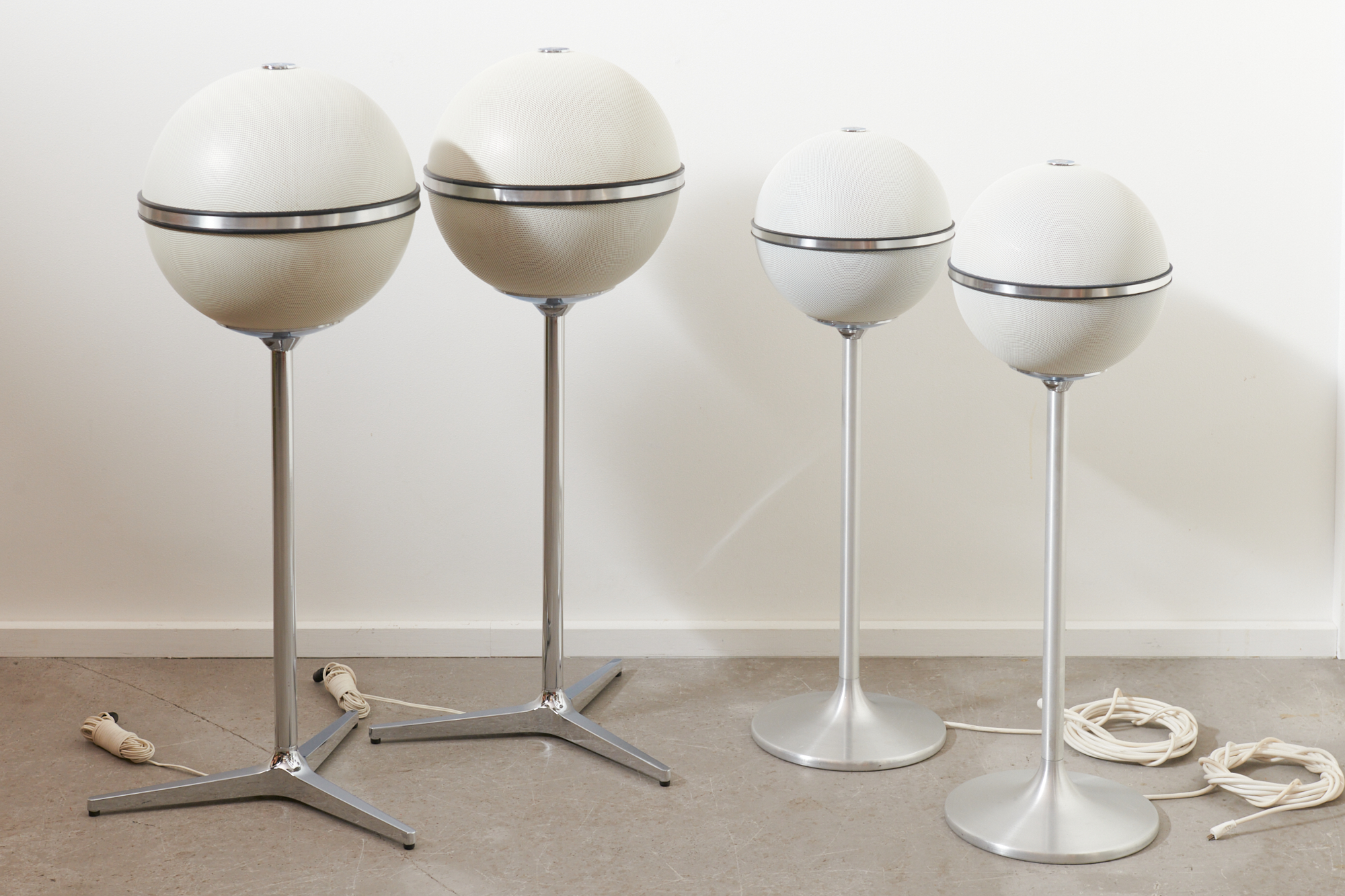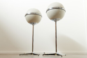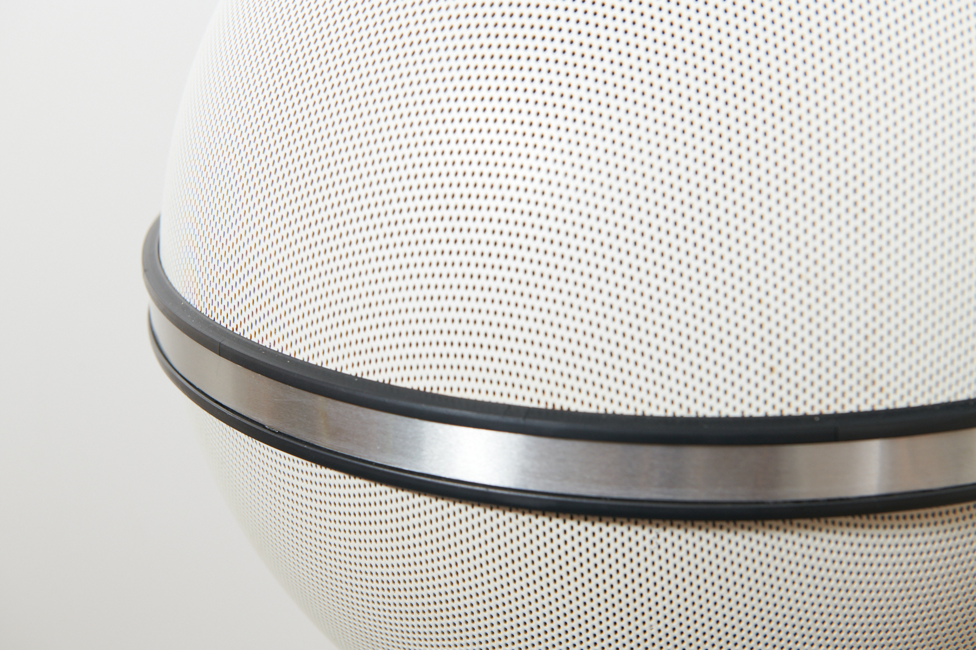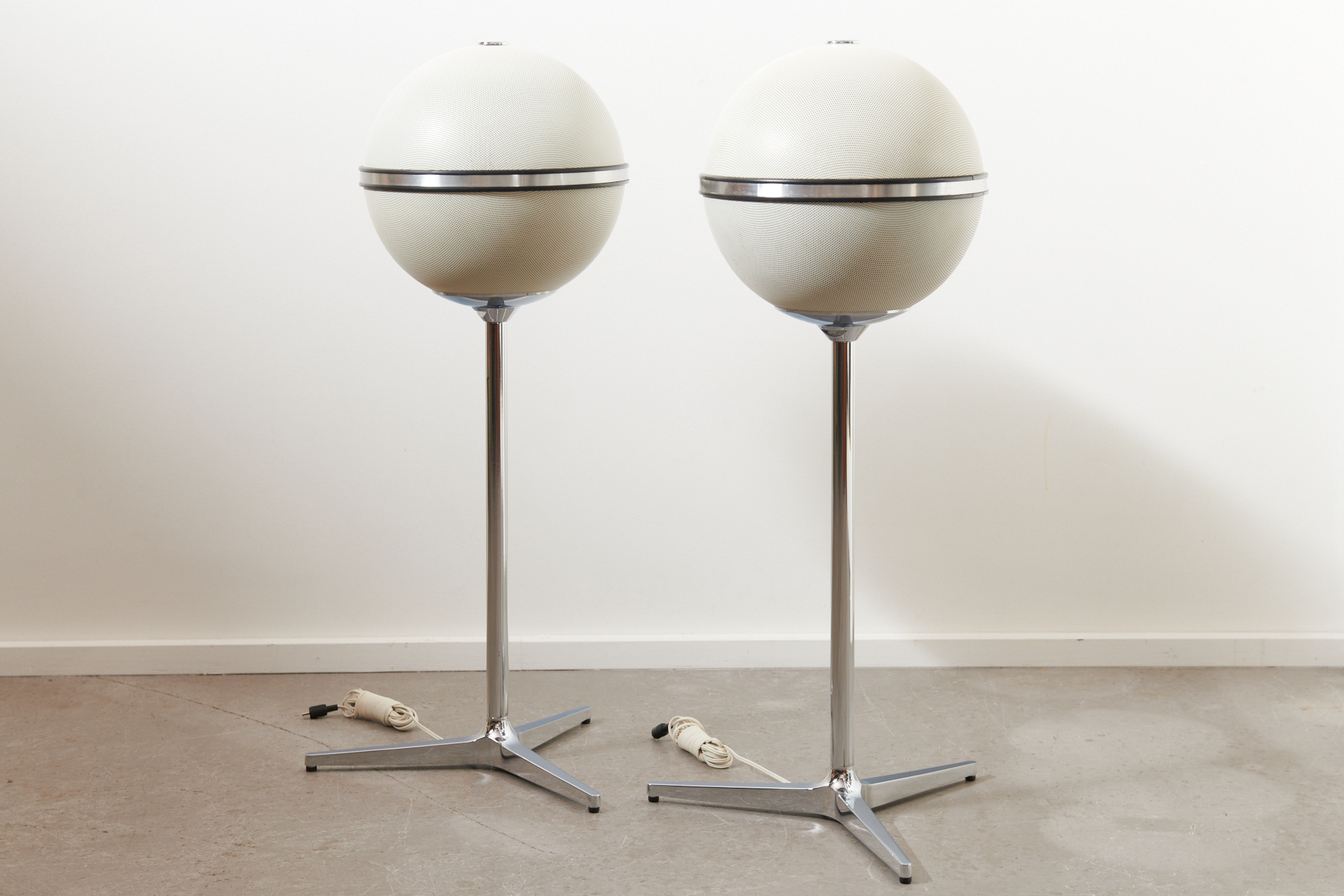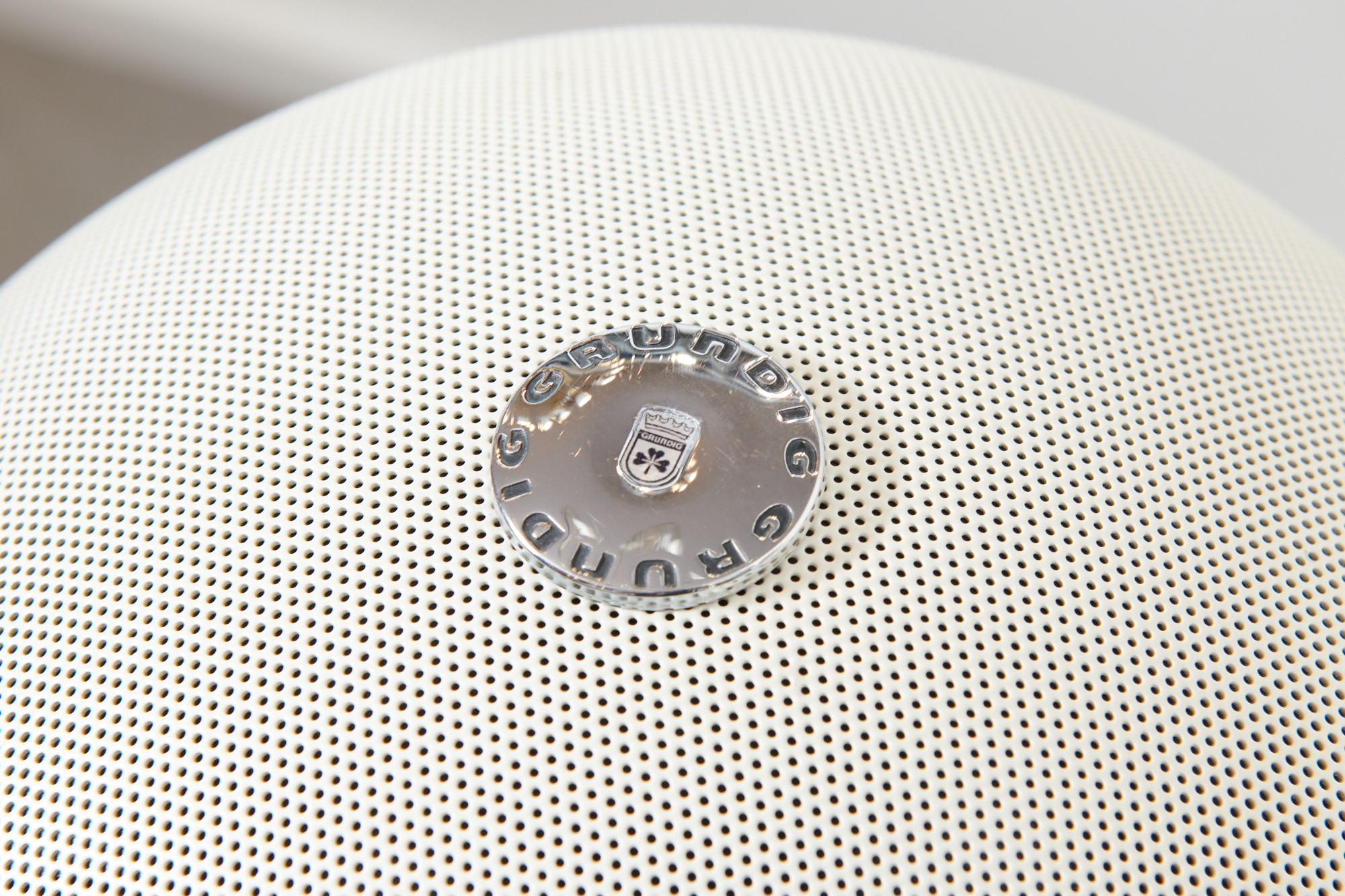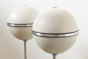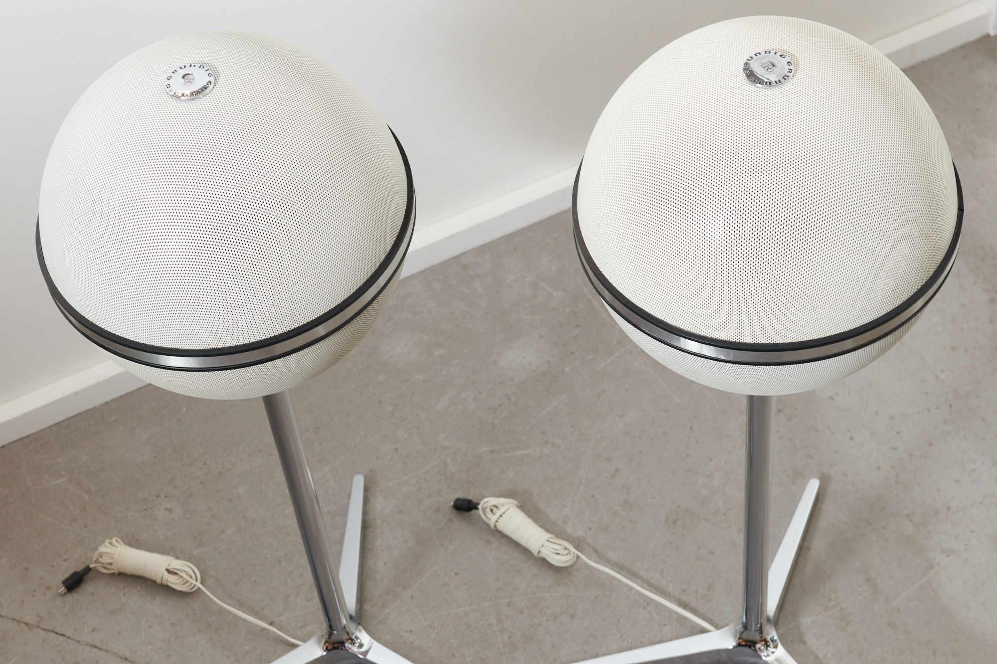 Revidiert & restauriert: Die Kultboxen mit dem grossartigen 3D-Klang: Weisse Kugellautsprecher GRUNDIG AUDIORAMA 7000 (1970), Made in Germany, mit original Dreifussständer, Metallgitter mit der weissen Originallackierung (!), neue DIN-Stecker (wir passen die Stecker kostenlos auf Ihren Verstärker an), Top Zustand!
