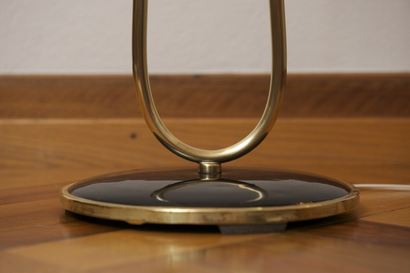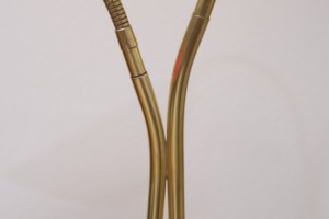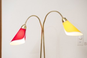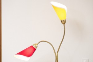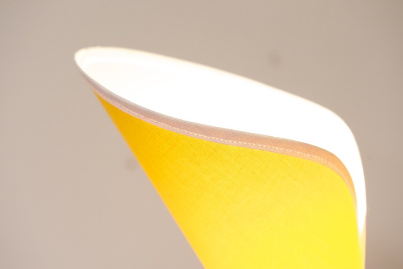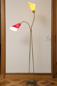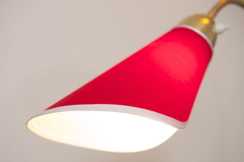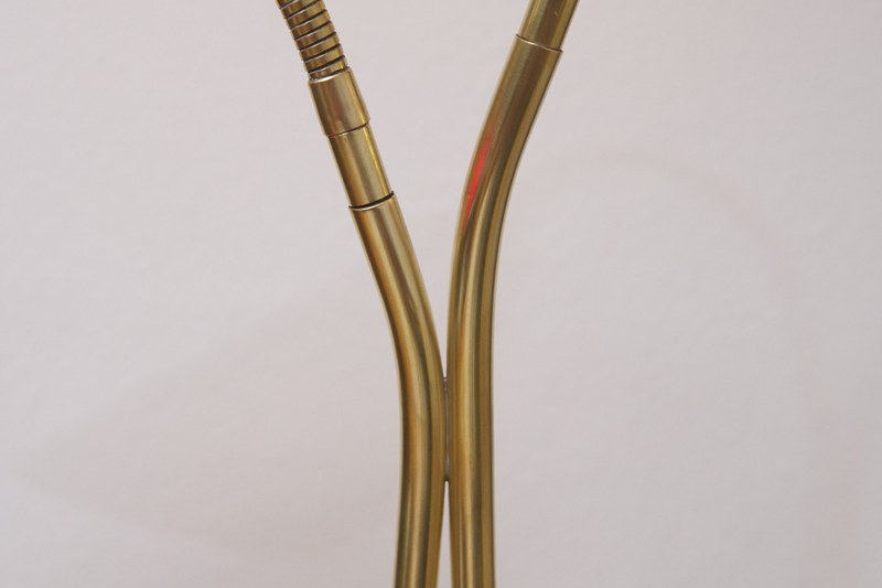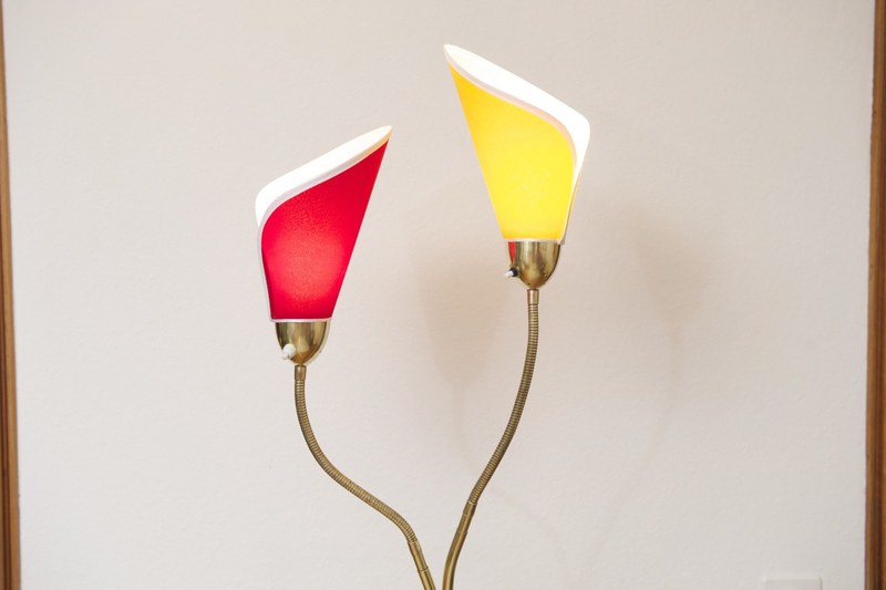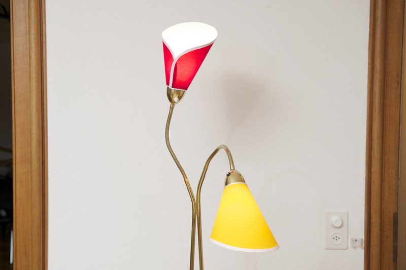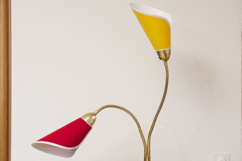 Italienische Stehleuchte DUO GIALLO ROSSO, neue gelbe & rote Tüten, lange Messingschwanenhälse, elegantes Gestänge, schwarzer Fuss, H 176cm