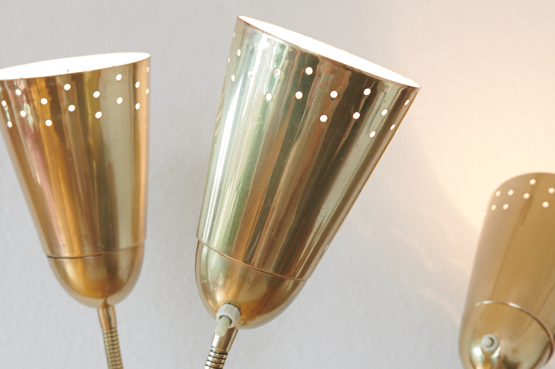 Restauriert: Stehleuchte ORO DELUSSO, 1950er, herrliche und sehr robuste Stehlampe komplett aus poliertem Messing, frei positionierbare starke Schwanenhälse, die goldenen Tüten haben Zierlöcher durch welche das Licht scheint, Druckschalter, 3x E27