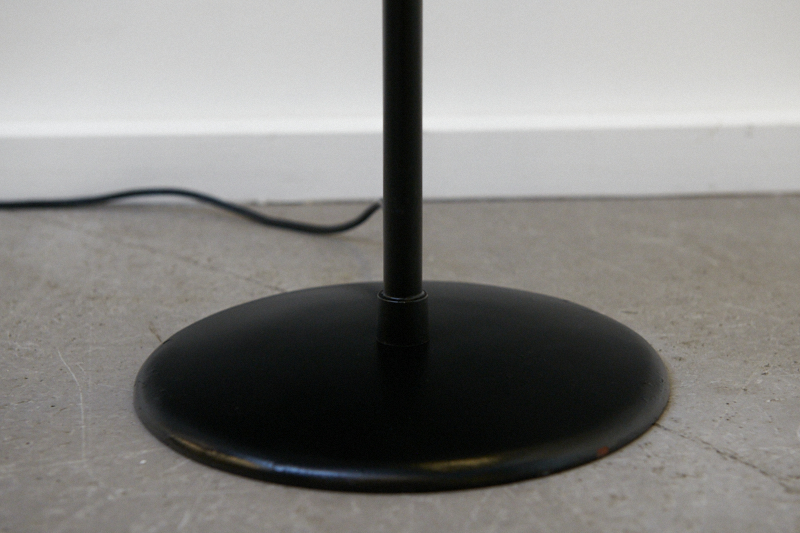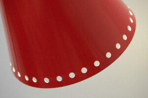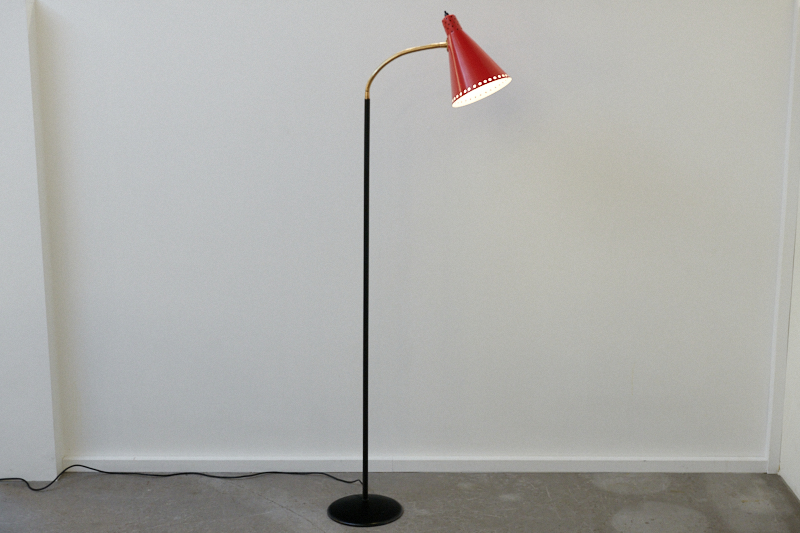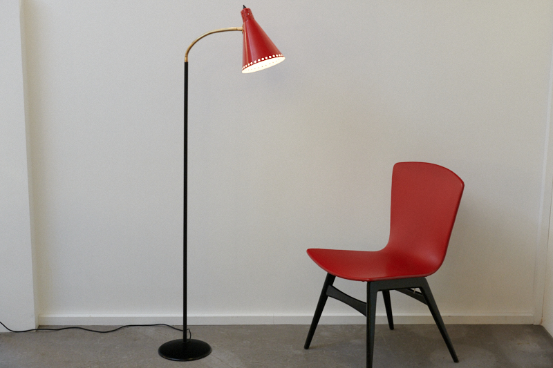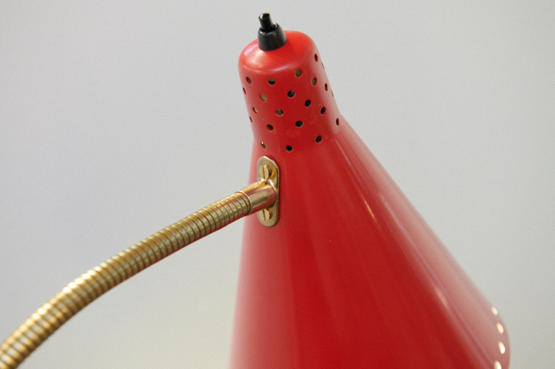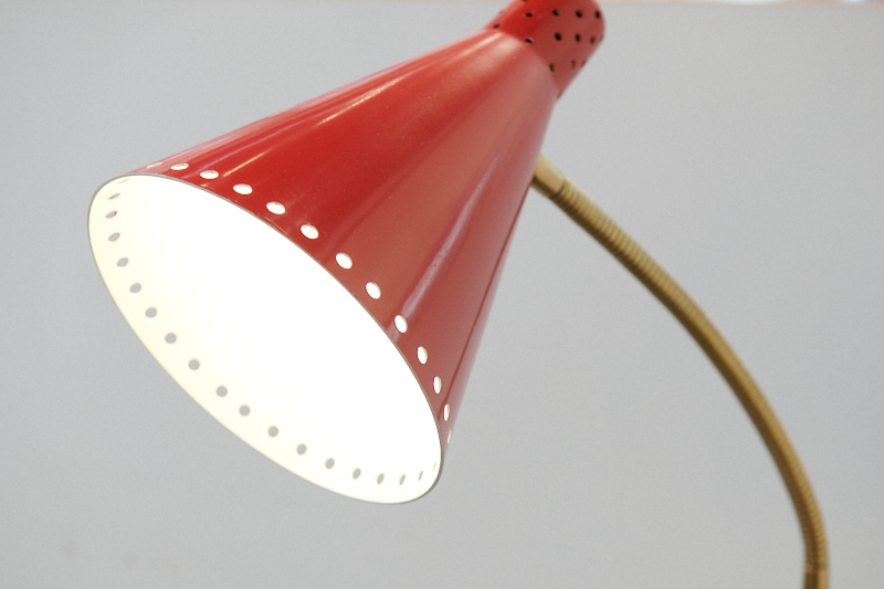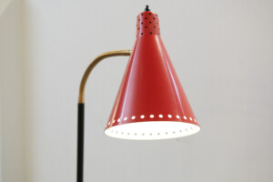 Restauriert: Stehleuchte ROTE SAMBA, 1950er, Made in Switzerland, rote Metalltüte mit Lochung, beweglicher Messingschwanenhals, schwarzer Metallfuss & -arm, Druckknopfschalter, E27