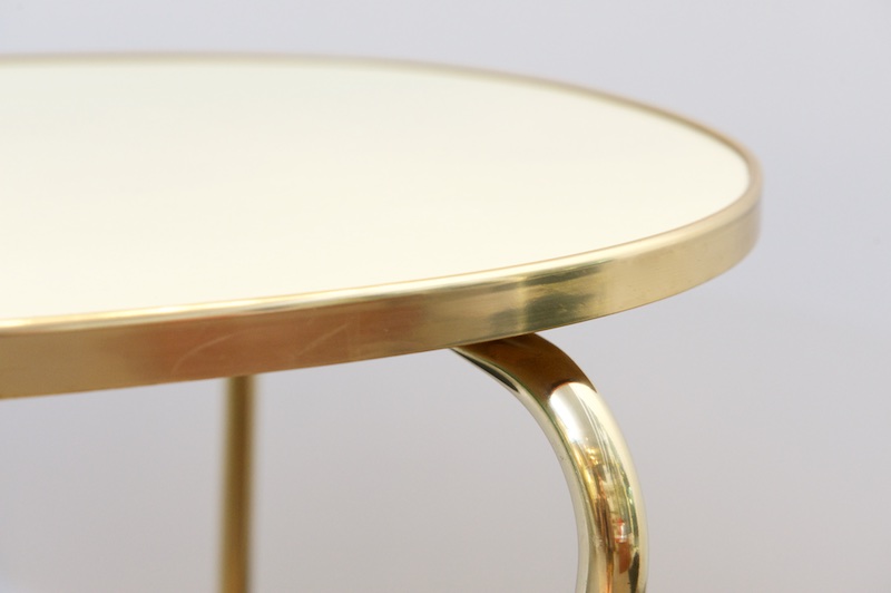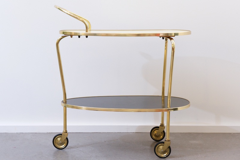 Restauriert: Servierwagen/Barwagen NIERE DeLuxe, 1950er, Resopaloberflächen in hellgelb & schwarz, goldene Umrandung, poliertes Messinggestänge, Messing-Rollen