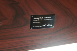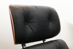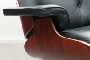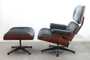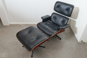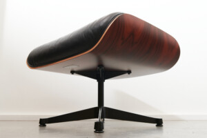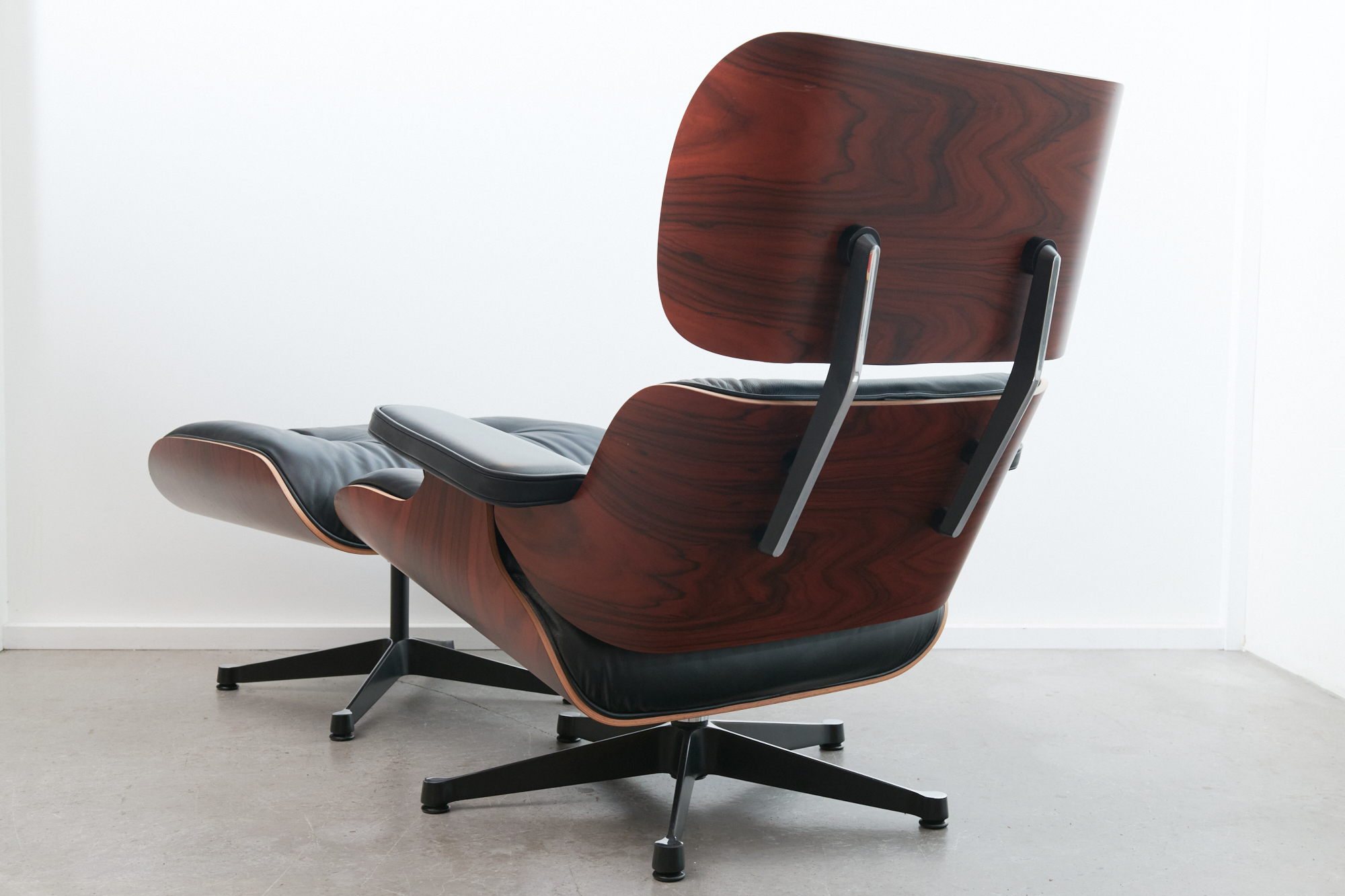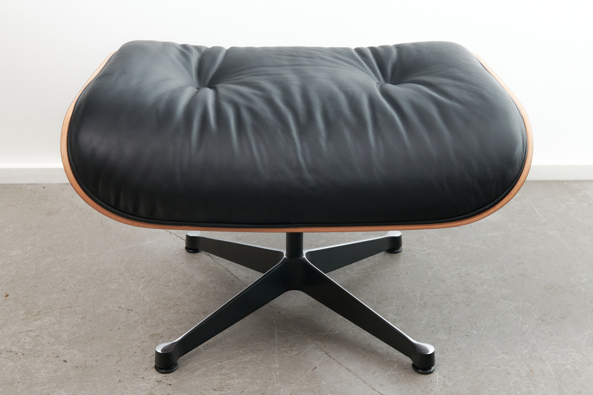 Wie neu: VITRA: EAMES Lounge Chair & Ottoman, Palisander, Design: 1956, RAY & CHARLES EAMES; Produktion: VITRA, komplett gereinigt, herrlich weiches seidenglänzendes Halbanilin-Echtleder, das edle Holz & das schwarze Leder wurden gepflegt und mit Schutz (inkl. UV-Schutz) versehen, Holzschalen aus wunderschön gemasertem Santos Palisander, mit den Originalmarken des Herstellers, Zustand wie neu! Oder besser, dank Highend-Schutz & Pflege