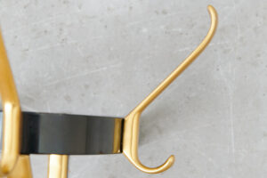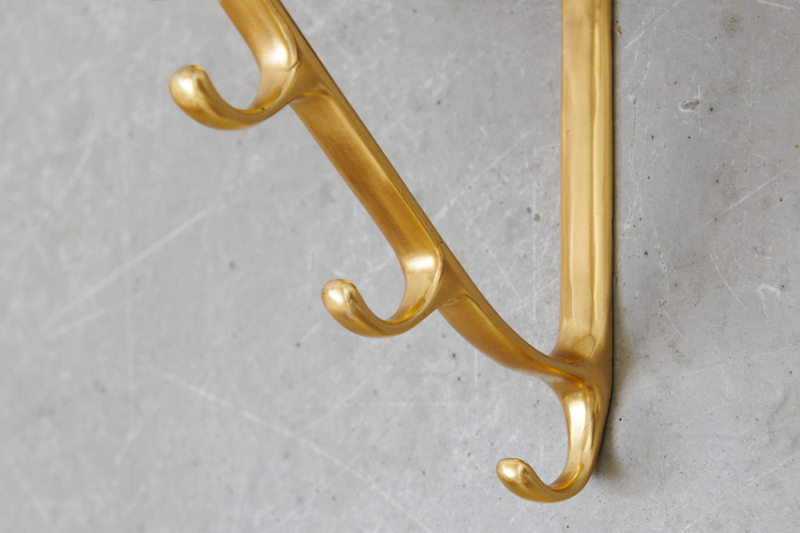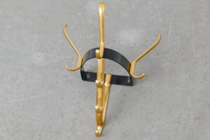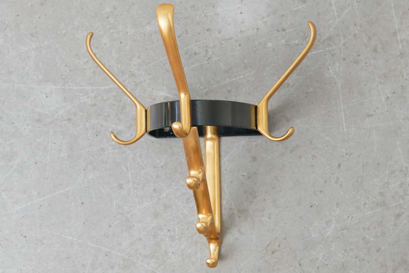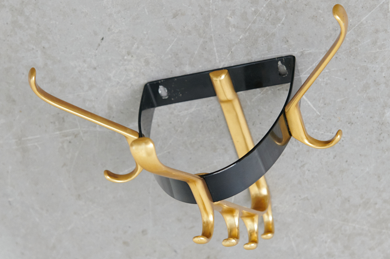 Restauriert: Wandgarderobe DIANA, Germany 1950er, einzigartiges Design, massiv, platzsparend, schwarzer Ring, Haken aus goldeloxiertem Aluminium, 3 Einzelhaken & 3 Doppelhaken