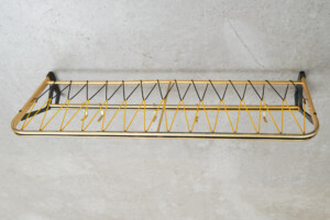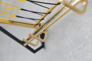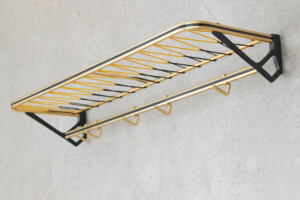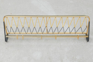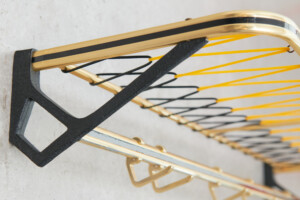 Restauriert: Wandgarderobe THALMANN, 1950er, 5 verstellbare Hacken, goldeloxiertes Aluminium, schwarze Metallseiten, Spaghetti-Bespannung in schwarz & gelb, robust, einfache Montage, top Zustand!