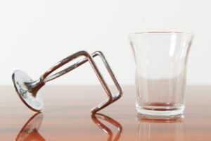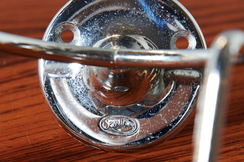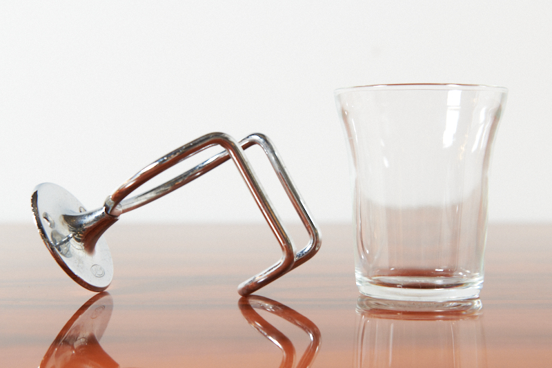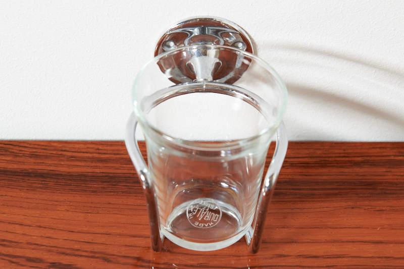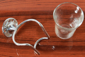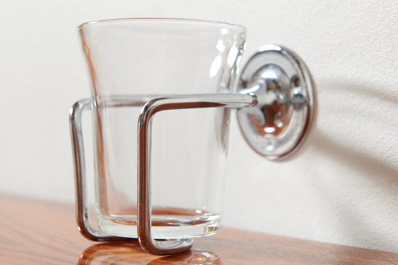 Restauriert: Zahnglashalter mit 1 Glas SANITAS II, Made in Switzerland, 1950er, Glas, Chromstahl, Zahngläser von DURALEX, France